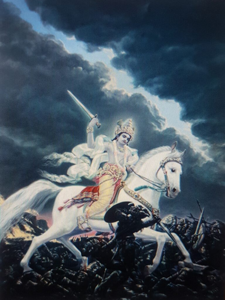 In einem derart aufgewühlten Bewusstseinsraum, den wir alle auf die eine oder andere Weise durchlaufen, kann es leicht passieren, dass aus der Tiefe des kollektiv Unbewussten die Sehnsucht nach einem Retter des Verlorenseins sich Weg bahnt. Einer, denn männlich wird er gedacht, also einer, der weiß, wie man das fast Unmögliche verspricht, obwohl man nie wissen kann, ob er’s halten kann oder wiedermal nur ein primitiver Ausbeuter war. Es gibt diese geistreichen Rettergestalten allerdings auch schon in uralten Epen, und ein paar von ihnen haben ja auch weltbewegenden Einfluss gehabt. Auf einer indischen Inkarnationstabelle kommt als 10. Avatar von Vishnu einer, der Kalki heißt. Er schwingt das Schwert der Gerechtigkeit, also da wird vermutlich Blut fließen, und reitet auf einem weißen Pferd. Nun erzeugen solche Kräfte, die sich im Raum verdichten, unterschiedliche Formen, d.h. w i e stellt man sich so eine Energie, wie sie jetzt als Gegenspieler im politischen Kampf zu erleben ist, als Form vor? Wie wird das sichtbar werden, wenn der Sturm Fahrt aufnimmt. Kalki selbst ist natürlich als prächtiger Halbgott dargestellt worden,