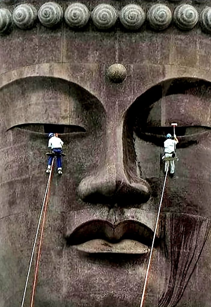 Das Bild habe ich gestern unter meinen Screenshots gefunden, und obwohl man annimmt oder denkt, der Buddha sei über Tränen hinausgegangen, sind hier zwei Menschen einen Moment lang zu Tränen des Buddhas geworden. In wirklicher Wirklichkeit sind sie ganz offensichtlich ausgewählt worden aus einer Gruppe hochbegabter Statuensäuberer (vermutlich ohne :innen), denen es ermöglicht wurde, in derartige Nähe zum als erleuchtet Gesehenen zu kommen, wer weiß, wer weiß. Denn um alles lässt sich herumfabulieren, auch um einen Krieg. Vielleicht passt deswegen die Vorstellung eines weinenden Buddhas mitten ins Zeitgeschehen. Denn wir, die wir uns auf so vielen Ebenen um Aufklärendes bemüht haben, senken auch unseren Blick zuweilen ins Tränenreich, jede tiefe Veränderung birgt ihre Verluste. Doch nun wieder hinab ins menschliche Jammertal !?, oder sind wir schon drin? Und wie unbedingt wesentlich ist es, zu wissen, was einem am Herzen liegt und was es braucht, um diesem Herzen Raum zu ermöglichen, und damit auch anderen. Und so schaut der Buddha tatsächlich mit gleichmütiger Gelassenheit durch das Oberflächencleansing hindurch. Denn was soll er machen? Auch er kann nur sein, wer er ist.