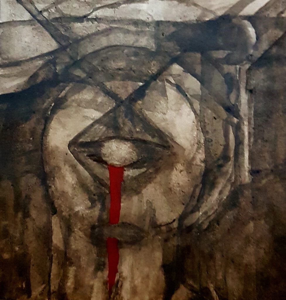 Vermutlich gibt es in der Menschheitshistorie wenig Zeitfenster, in denen Mord und Totschlag unbekannt waren. Auch von Kindergartenanekdoten hört man, dass es immer welche gibt, die den oder die andere/n überwältigen wollen, also ich zeig‘ dir mal, wär hier der Stärkere ist. Und dann, sagte mal eine Yogini zu mir bei der gemeinsamen Reflektion dieser Problematik, kommt es auch immer auf ‚die Anderen‘ an, also d i e, die dann entweder ja oder nein dazu sagen. Oder gar nicht wissen, um was es ihnen jetzt auf einmal gehen soll, wenn Nur-eine-Meinung-haben auf einmal so unzureichend scheint wie zur Zeit. Natürlich gibt es auch kampfbereite Frauen und Alltagsheld:innen, deren Namen genauso wenig bekannt sind wie die der vielen toten Soldaten. Aber es sind doch meistens Männer, die dieser Spielart zugetan sind. Das Schlachtfeld kann auf Ölschinken wunderbar dargestellt werden, ist aber sehr hässlich. Die Verzweiflung, die Wunden, das vorzeitliche Sterben und der Starrsinn des Todes. Doch die Leidenschaft des Mannes für Waffen ist eindeutig. Wie ein kollektiver Taubheitsanfall fällt der schwere Samtmantel über die Erinnerung. An die Raubzüge, an die Kindermorde, die Vergewaltigungen, das radikale Scheitern an sich selbst. Denn wenn er wüsste, würde er doch nicht, und doch, er würde und wird, und tut genau das immer wieder. Wie lange, das weiß man nicht. Man weiß auch nicht, ob wohl an einem bestimmten Punkt der Geschehnisse das Zerstörungsgen ausbricht, um der Erstarrung einen Impuls zu geben. Die Wahrnehmung des Weltkonzeptes als einem dem Bewusstsein untergeordneten Konstrukt überlässt immerhin genau diesem, (dem Bewusstsein), die kreative Möglichkeit, neue Ordnungen herzustellen. Allerdings braucht es auch in diesem Sinne der Darstellung trotz aller Widersprüchligkeiten noch die Kraft der gemäßigten Bezeugung.