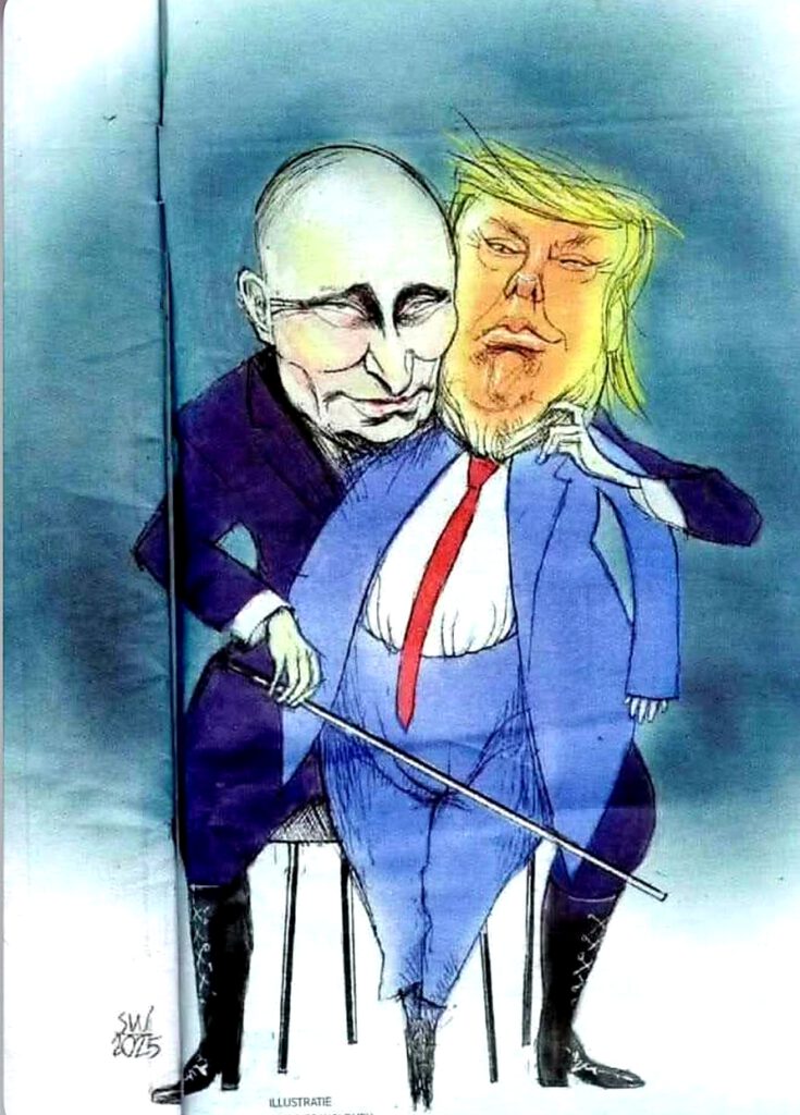 Den Comic hat mir gerade meine Freundin Shivani aus Indien geschickt, und der zeigt mal wieder, dass auch humorvolle Bissigkeiten eine Möglichkeit der Völkerverständigung bieten. Der Witz kann, wie einiges andere auch, selbst ohne Worte verstanden werden. Und so könnte diese international so gesehene Farce in Alaska vielleicht dem tapferen Selenskij zugute kommen, wenn es Trump vermutlich derart aufgestoßen ist, dass er nicht als Sieger oder potentieller Friedensnobelpreisempfänger aus der Nummer hervorgegangen ist. Wenn dann irgendwann sogar einem Diktator mal klar wird, dass irgendwas zu seinen Ungunsten anfängt sich zu bewegen und, zuerst langsam und wie eine zähe Gehirnwolkenmasse, oft schon sehr lange, sich zwischen Realität und Diktatorengehirn geschoben hat, dann fängt ein schlimmes Ahnen an. Und dann dauert es wieder eine lange Weile, bis es zur Gewissheit wird. Zum Glück kann auch so gut wie niemand J.D. Vance leiden, und wenn es den Amerikanern wirklich eines Tages gelingen sollte, Trump loszuwerden, kann man sie sicherlich dann als gereiftere Frucht eines atemberaubenden Psychoprozesses erfahren, vielleicht aber auch nicht. Sein kann aber auch ebenfalls, dass Amerika so richtig untergehen muss, wie so viele Kulturen untergegangen sind. Das war nun mal die ehemalige Freiheitskultur, die Vereinigten Staaten, wo man hinging, um alles Mögliche umzusetzen, was woanders eben nicht möglich war. Undenkbar die mystifizierten Sixties ohne Amerika, die derart viel neue Weltordnung brachten, weil genug Menschen keinen Bock mehr hatten auf das, was ihnen von der kriegsdurchtobten Welt angeboten wurde. Wenn es nur nicht immer mit so viel Menschen-und Tierleid daherkäme, das sogenannte neue System, das ja letztendlich auch nur ein Durchschütteln und Rütteln an den Gefängnisstäben ist, deren wir meist erst durch Erstarren und Einfrieren des Lebensatems gewahr werden. Das ist aber, womit der Diktator rechnet, also mit dem Erlöschen des persönlichen Atems und des Freiheitswillens, denn ein Mensch, der frei atmet, kann nicht kontrolliert werden, und selbst die untertänigsten Kriecher sind zuweilen schon erwacht, oder passiert das meistens nur in Filmen. Und so sitzt man heute, am Montag, wieder zurück im Nu und wünscht Selenskij möglichst carte blanche, umringt von der Gruppe der Willigen, und trotzen vielleicht dem sinkenden Ungeheuer, und sagen zueinander vielleicht schon im Flugzeug: fürchte dich nicht, weil sich ja doch alle ein bisschen vor dem Unmenschlichsein fürchten.