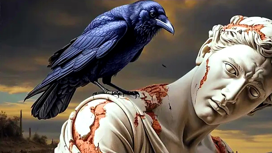 Das Bild habe ich aus dem Netz gefischt, es war da als vorbeihuschender Nu, als Beiwerk eines Vortrags und ist offensichtlich K.I.-generiert, also kein Künstler dahinter. Oder doch kunstfähig, die Maschine?, wird eines der vielen Themen sein, die die Gesellschaften beschäftigen wird. Ich musste mich natürlich fragen, was mich an diesem doch ziemlich gruseligen Bild anspricht. Vielleicht, weil es als Projektionsfläche so viel Symbolkraft hat. Und da ich es mit m e i n e n Augen sehe, sehe ich den Raben einerseits als den Weisheitsträger, der dem leerblickenden Geschöpf schwere Wunden zugefügt hat. Und wirklich schrecklich ist dieser schon fast tote Blick, der einen anstarrt als das Nichts, das menschlich Erloschene, das in technische Erstarrung getriebene Wissen, das missbrauchte Wissen, das nicht mehr kontrollierbare Wissen. Das, finde ich, starrt einen da an, und ganz gut, das muss man zugeben, kann es malen und kann es starren. Und in der Tat: sie ist da, die neue Weltordnung. Es sind immer die Rituale, die solche großen Zeitenwenden dann bildlich verkünden. Freundlich spielen sich die neuen Herrscher (aus China, Russland, Indien, Korea) ihre gewaltigen und gefährlichen Bälle zu, und auf einmal sieht die Welt ganz anders aus. Und er läuft ja schon eine ganze Weile, der Cyberkrieg, denn eigentlich sollte es doch Amerika sein, das die ganze Welt unter den Dämonennagel reißt. Aber nein, Trump, der alberne Trump, hat alle verprellt, und nun hat er auf einmal außer seiner Speichelleckerbande keine Verbündeten mehr. Und nun wissen auch genug Menschen, was schmutziges Theater ist, und leider werden viele davon sehr krank. So ist es geradezu eine Pflicht für den oder die Einzelne/n, sich gut um sich selbst zu kümmern, damit man die noch vorhandene Gunst der Stunde nutzt, um der oder die oder das zu werden oder zu sein, was man von sich möchte. Und warum sollte es einem versagt sein, einen guten Einsatz zu geben. Man kann die Geschichte ja weder verändern noch vorzeitig verlassen. Daher lohnt es sich, darüber nachzudenken, was man unter einem guten Spiel versteht.